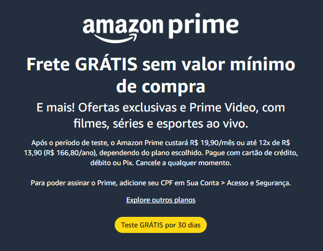 - Redes Sociais: Siga a @amazonbrasil para ficar por dentro de grandes eventos como o Prime Day, Black Friday e Book Friday.