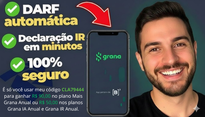 É só você usar meu código CLA79444 para ganhar R$ 90,00 no plano Mais Grana Anual ou R$ 50,00 nos planos Grana IA Anual e Grana IR Anual.