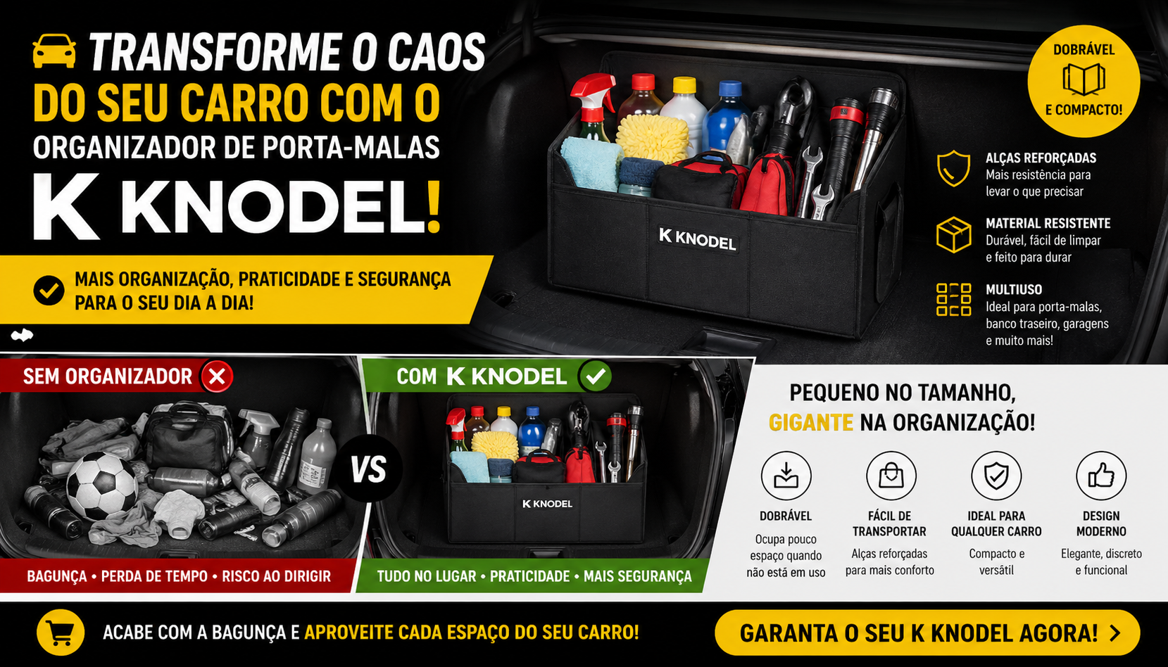 Organizador de Porta-Malas K KNODEL: transforme a bagunça do seu carro em praticidade inteligente em segundos! 🚗✨